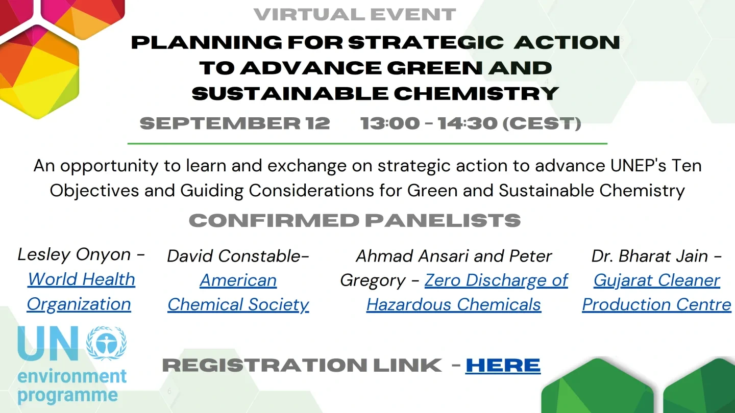 Join us online (Registration Link) September 12th from 13h00 to 14h30 (Central European Time) for an open session to learn and exchange on “Planning for Strategic Action to Advance Green and Sustainable Chemistry”.