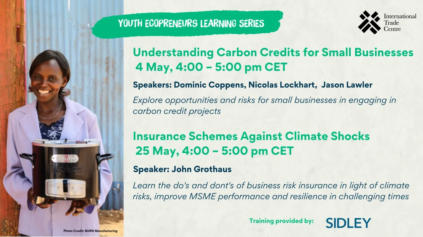 As part of the Youth Ecopreneur Learning Series, a learning series dedicated for young entrepreneurs aspire to grow their green business, the International Trade Centre will host two webinars with experts from Sidley Austin LLP in May.
