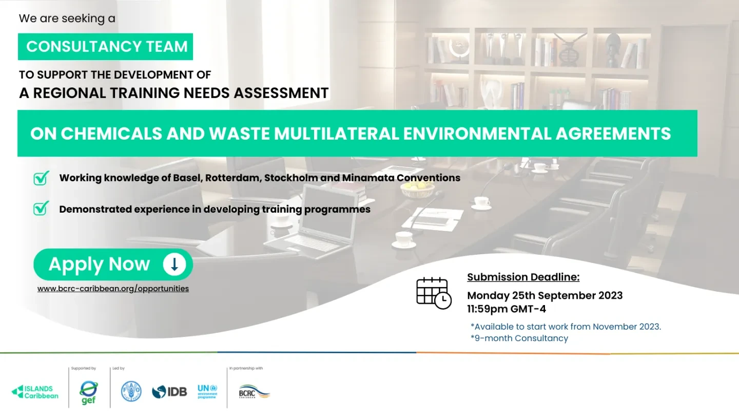 The BCRC-Caribbean, as the executing agency for the GEF 10279 and 10472 Projects, is seeking to recruit a suitably qualified and experienced consulting team to conduct a regional training needs assessment on these chemicals and waste multilateral environmental agreements for all twelve (12) project countries.